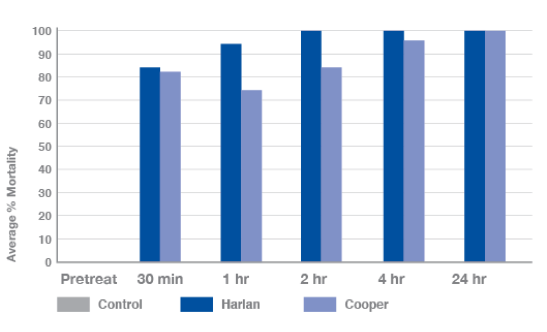 Direct sprays from PT Alpine Flea & Bed Bug Pressurized Insecticide demonstrated 100% control of bed bugs from pyrethroid-resistant field strain (Cooper 2) within 24 hours and susceptible strain (Harlan) within two hours.